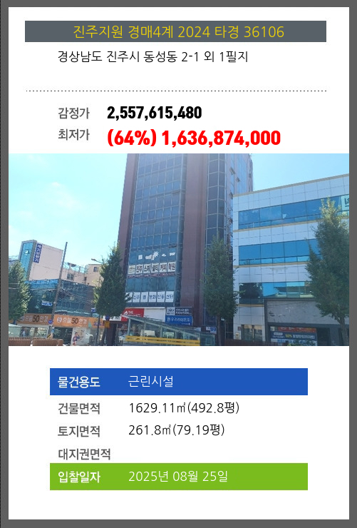 사건번호 2024 타경 36106 본건은 경상남도 진주시 동성동 2-1 외 1필지소재하는 근린시설경매 물건의 포스팅입니다. 건물면적 [ 1629.11㎡ (492.8평) ]토지면적 [ 261.8㎡ (79.19평) ] 시세를 반영한