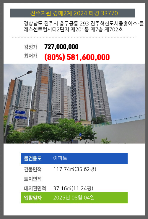 사건번호 2024 타경 33770 본건은 경상남도 진주시 충무공동 293 진주혁신도시중흥에스-클래스센트럴시티2단지 제201동 제7층 제702호소재하는 아파트경매 물건의 포스팅입니다. 건물면적 [ 117.74㎡ (35.62평) ]대지권 [ 37.16㎡ (11.24평) ]
