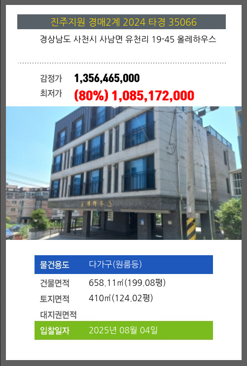 사건번호 2024 타경 35066 본건은 경상남도 사천시 사남면 유천리 19-45 올레하우스소재하는 다가구(원룸등)경매 물건의 포스팅입니다. 건물면적 [ 658.11㎡ (199.08평) ]토지면적 [ 410㎡ (124.02평) ] 시세를 반영한