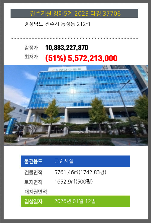 사건번호 2023 타경 37706 본건은 경상남도 진주시 동성동 212-1소재하는 근린시설경매 물건의 포스팅입니다. 건물면적 [ 5761.46㎡ (1742.83평) ]토지면적 [ 1652.9㎡ (500평) ] 시세를 반영한 감정가 10,883,227,870에서3회