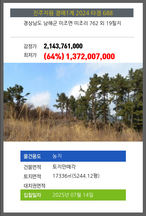 사건번호 2024 타경 688 본건은 경상남도 남해군 미조면 미조리 762 외 19필지소재하는 농지경매 물건의 포스팅입니다. 건물면적 [ 토지만매각 ]토지면적 [ 17336㎡ (5244.12평) ] 시세를 반영한