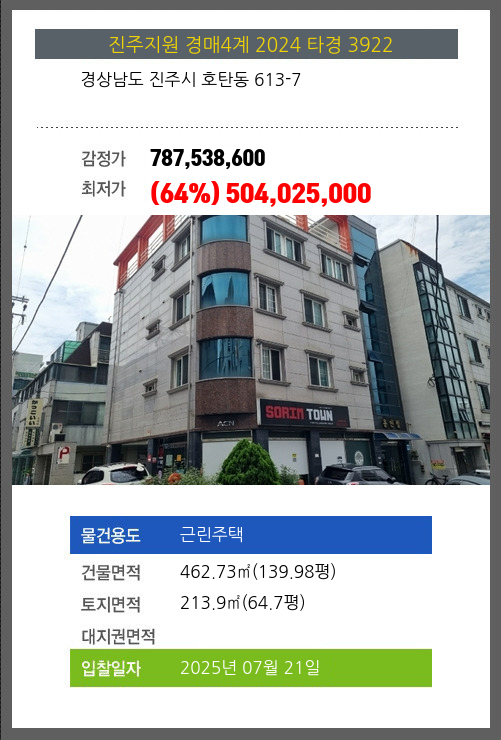 사건번호 2024 타경 3922 본건은 경상남도 진주시 호탄동 613-7소재하는 근린주택경매 물건의 포스팅입니다. 건물면적 [ 462.73㎡ (139.98평) ]토지면적 [ 213.9㎡ (64.7평) ] 시세를 반영한 감정가 787,538,600에서2회