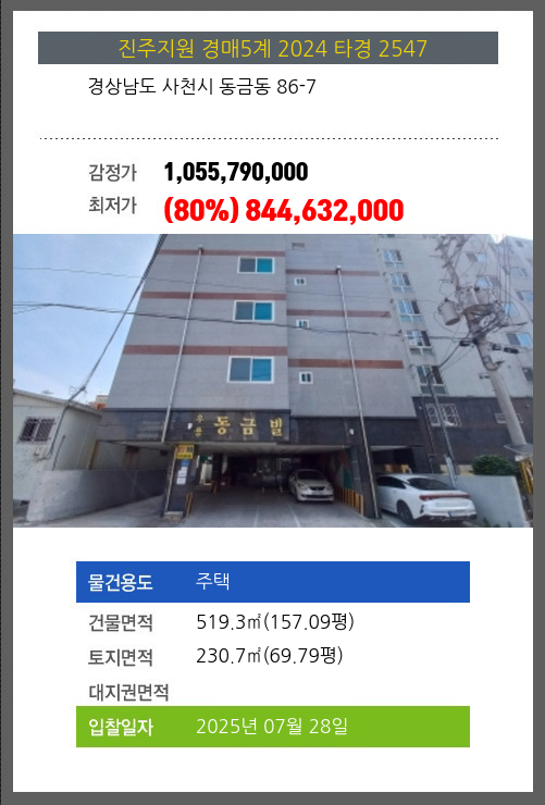사건번호 2024 타경 2547 본건은 경상남도 사천시 동금동 86-7소재하는 주택경매 물건의 포스팅입니다. 건물면적 [ 519.3㎡ (157.09평) ]토지면적 [ 230.7㎡ (69.79평) ] 시세를 반영한 감정가 1,055,790,000에서1회