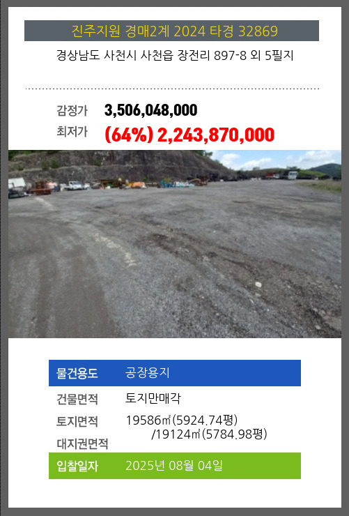 사건번호 2024 타경 32869 본건은 경상남도 사천시 사천읍 장전리 897-8 외 5필지소재하는 공장용지경매 물건의 포스팅입니다. 건물면적 [ 토지만매각 ]토지면적 [ 전체:19586㎡ (5924.74평) 매각지분:19124㎡ (5784.98평) ]