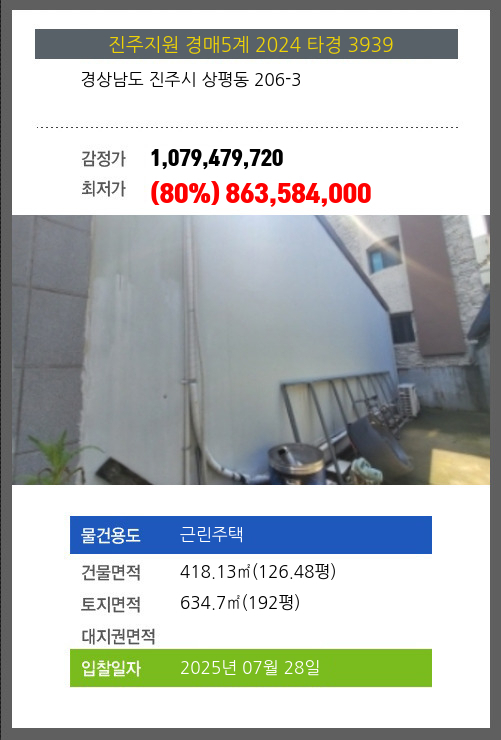 사건번호 2024 타경 3939 본건은 경상남도 진주시 상평동 206-3소재하는 근린주택경매 물건의 포스팅입니다. 건물면적 [ 418.13㎡ (126.48평) ]토지면적 [ 634.7㎡ (192평) ] 시세를 반영한 감정가 1,079,479,720에서1회