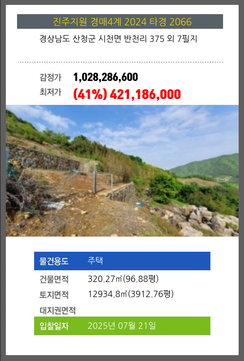 사건번호 2024 타경 2066 본건은 경상남도 산청군 시천면 반천리 375 외 7필지소재하는 주택경매 물건의 포스팅입니다. 건물면적 [ 320.27㎡ (96.88평) ]토지면적 [ 12934.8㎡ (3912.76평) ] 시세를