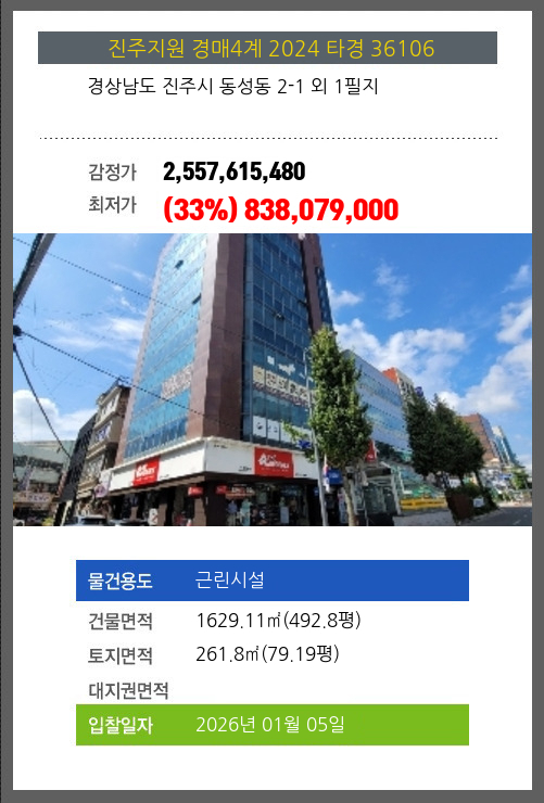 사건번호 2024 타경 36106 본건은 경상남도 진주시 동성동 2-1 외 1필지소재하는 근린시설경매 물건의 포스팅입니다. 건물면적 [ 1629.11㎡ (492.8평) ]토지면적 [ 261.8㎡ (79.19평) ] 시세를 반영한