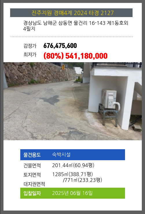 사건번호 2024 타경 2127 본건은 경상남도 남해군 삼동면 물건리 16-143 제1동호외 4필지소재하는 숙박시설경매 물건의 포스팅입니다. 건물면적 [ 201.44㎡ (60.94평) ]토지면적 [ 전체:1285㎡ (388.71평) 매각지분:771㎡ (233.23평)