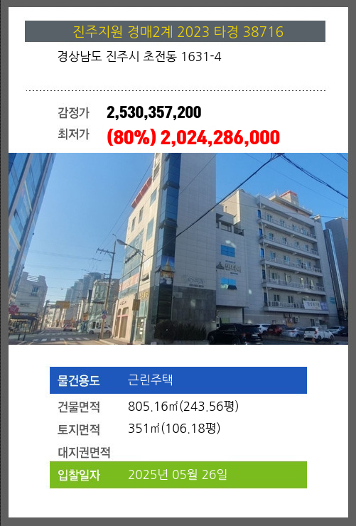 사건번호 2023 타경 38716 본건은 경상남도 진주시 초전동 1631-4소재하는 근린주택경매 물건의 포스팅입니다. 건물면적 [ 805.16㎡ (243.56평) ]토지면적 [ 351㎡ (106.18평) ] 시세를 반영한 감정가 2,530,357,200에서1회