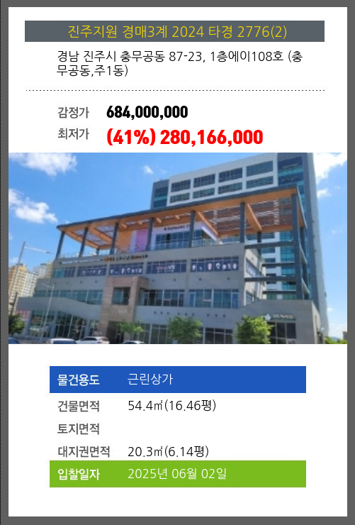 사건번호 2024 타경 2776(2) 본건은 경남 진주시 충무공동 87-23, 1층에이108호 (충무공동,주1동)소재하는 근린상가경매 물건의 포스팅입니다. 건물면적 [ 54.4㎡ (16.46평) ]대지권 [ 20.3㎡ (6.14평) ] 시세를 반영한