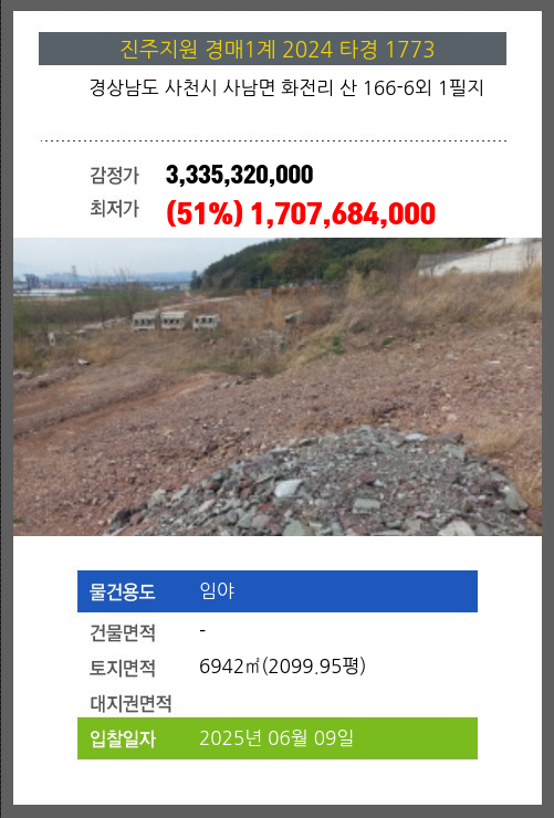 사건번호 2024 타경 1773 본건은 경상남도 사천시 사남면 화전리 산 166-6외 1필지소재하는 임야경매 물건의 포스팅입니다. 토지면적 [ 6942㎡ (2099.95평) ] 시세를 반영한 감정가 3,335,320,000에서3회 유찰되어