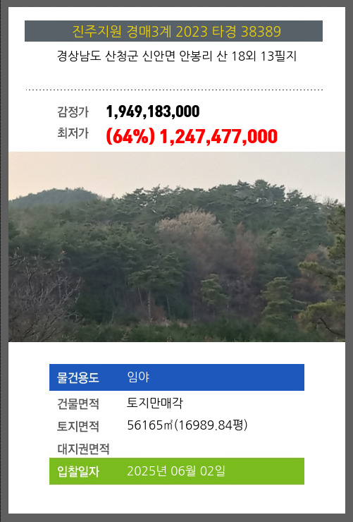 사건번호 2023 타경 38389 본건은 경상남도 산청군 신안면 안봉리 산 18외 13필지소재하는 임야경매 물건의 포스팅입니다. 건물면적 [ 토지만매각 ]토지면적 [ 56165㎡ (16989.84평) ] 시세를 반영한