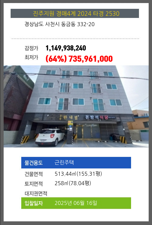 사건번호 2024 타경 2530 본건은 경상남도 사천시 동금동 332-20소재하는 근린주택경매 물건의 포스팅입니다. 건물면적 [ 513.44㎡ (155.31평) ]토지면적 [ 258㎡ (78.04평) ] 시세를 반영한 감정가 1,149,938,240에서2회