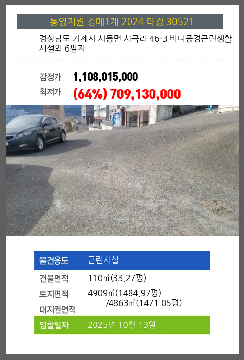 사건번호 2024 타경 30521 본건은 경상남도 거제시 사등면 사곡리 46-3 바다풍경근린생활시설외 6필지소재하는 근린시설경매 물건의 포스팅입니다. 건물면적 [ 110㎡ (33.27평) ]토지면적 [ 전체:4909㎡ (1484.97평) 매각지분:4863㎡ (1471.05평)