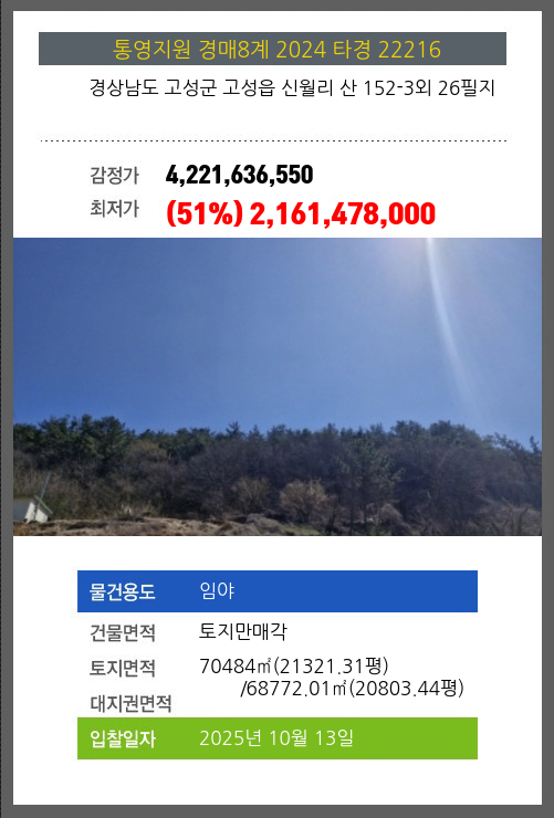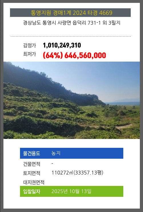 사건번호 2024 타경 1875(4) 본건은 경상남도 고성군 동해면 장좌리 산 103외 2필지소재하는 임야경매 물건의 포스팅입니다. 토지면적 [ 446121㎡ (134951평) ] 시세를 반영한 감정가 1,266,710,800에서2회 유찰되어