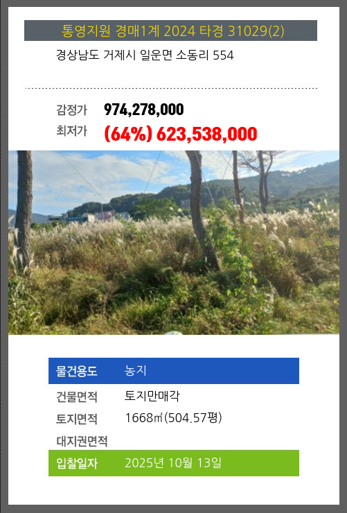 사건번호 2024 타경 31029(2) 본건은 경상남도 거제시 일운면 소동리 554소재하는 농지경매 물건의 포스팅입니다. 건물면적 [ 토지만매각 ]토지면적 [ 1668㎡ (504.57평) ] 시세를 반영한 감정가 974,278,000에서2회