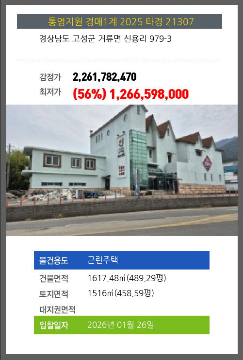 사건번호 2025 타경 21307 본건은 경상남도 고성군 거류면 신용리 979-3소재하는 근린주택경매 물건의 포스팅입니다. 건물면적 [ 1617.48㎡ (489.29평) ]토지면적 [ 1516㎡ (458.59평) ] 시세를 반영한 감정가