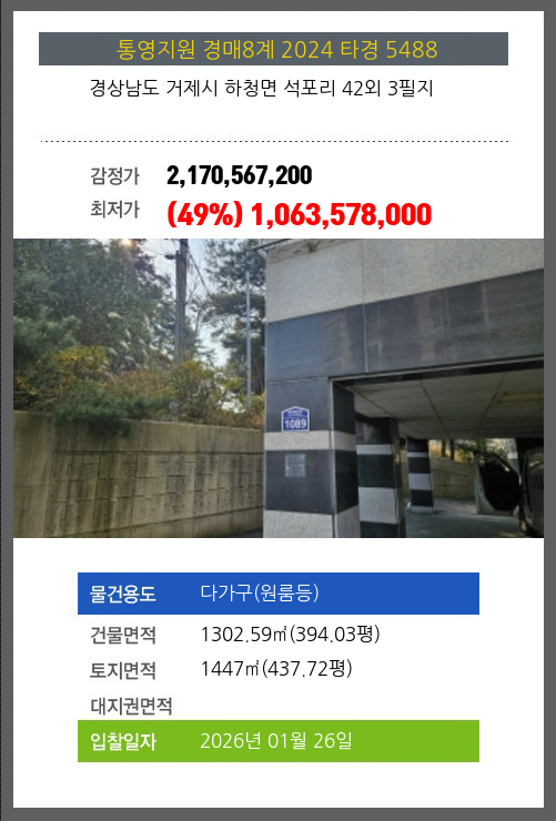 사건번호 2024 타경 5488 본건은 경상남도 거제시 하청면 석포리 42외 3필지소재하는 다가구(원룸등)경매 물건의 포스팅입니다. 건물면적 [ 1302.59㎡ (394.03평) ]토지면적 [ 1447㎡ (437.72평) ] 시세를 반영한