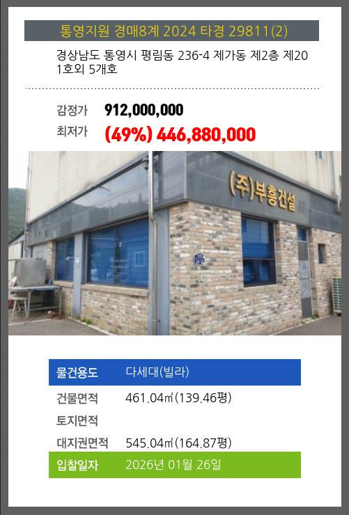 사건번호 2024 타경 29811(2) 본건은 경상남도 통영시 평림동 236-4 제가동 제2층 제201호외 5개호소재하는 다세대(빌라)경매 물건의 포스팅입니다. 건물면적 [ 461.04㎡ (139.46평) ]대지권 [ 545.04㎡ (164.87평) ]