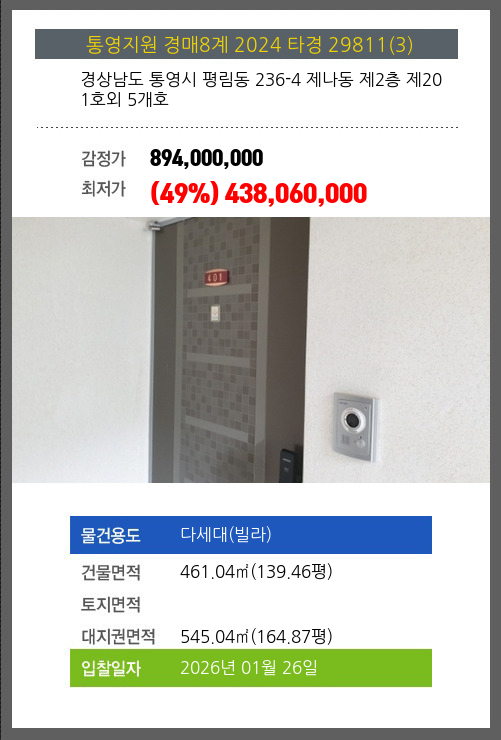 사건번호 2024 타경 29811(3) 본건은 경상남도 통영시 평림동 236-4 제나동 제2층 제201호외 5개호소재하는 다세대(빌라)경매 물건의 포스팅입니다. 건물면적 [ 461.04㎡ (139.46평) ]대지권 [ 545.04㎡ (164.87평) ]