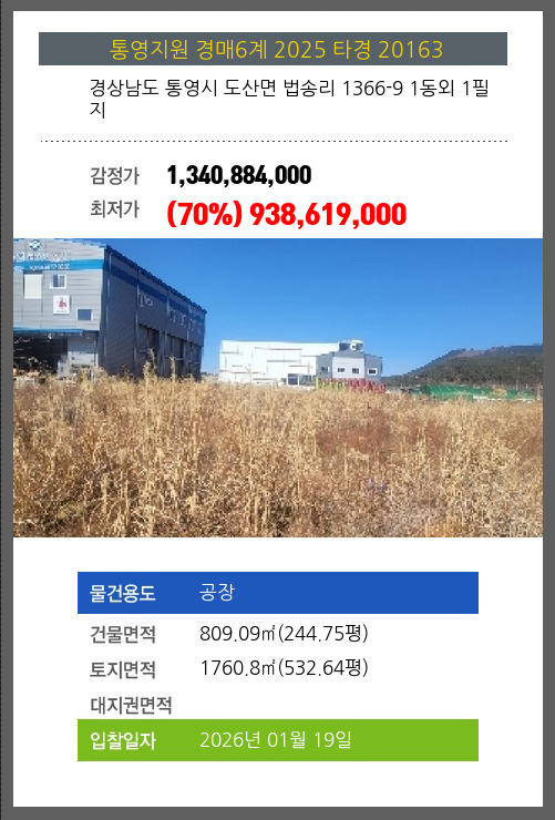 사건번호 2025 타경 20163 본건은 경상남도 통영시 도산면 법송리 1366-9 1동외 1필지소재하는 공장경매 물건의 포스팅입니다. 건물면적 [ 809.09㎡ (244.75평) ]토지면적 [ 1760.8㎡ (532.64평) ] 시세를