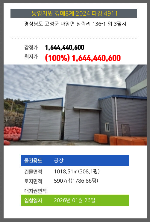 사건번호 2024 타경 4911 본건은 경상남도 고성군 마암면 삼락리 136-1 외 3필지소재하는 공장경매 물건의 포스팅입니다. 건물면적 [ 1018.51㎡ (308.1평) ]토지면적 [ 5907㎡ (1786.86평) ] 시세를