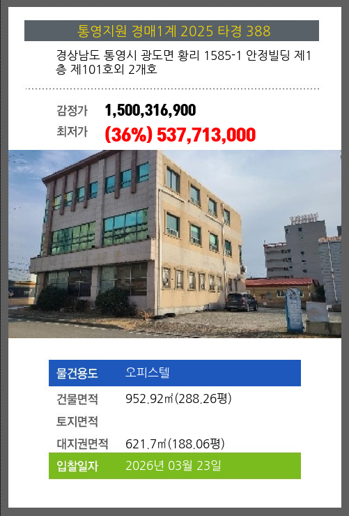 사건번호 2025 타경 388 본건은 경상남도 통영시 광도면 황리 1585-1 안정빌딩 제1층 제101호외 2개호소재하는 오피스텔경매 물건의 포스팅입니다. 건물면적 [ 952.92㎡ (288.26평) ]대지권 [ 621.7㎡ (188.06평)