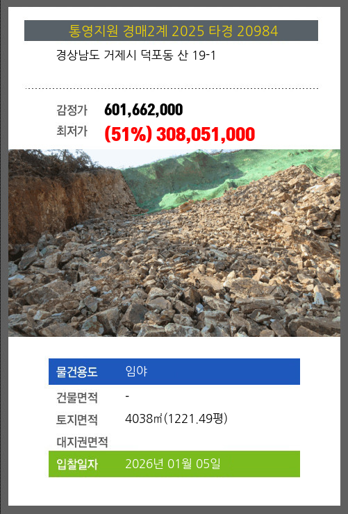 사건번호 2025 타경 20984 본건은 경상남도 거제시 덕포동 산 19-1소재하는 임야경매 물건의 포스팅입니다. 토지면적 [ 4038㎡ (1221.49평) ] 시세를 반영한 감정가 601,662,000에서3회 유찰되어 감정가 대비