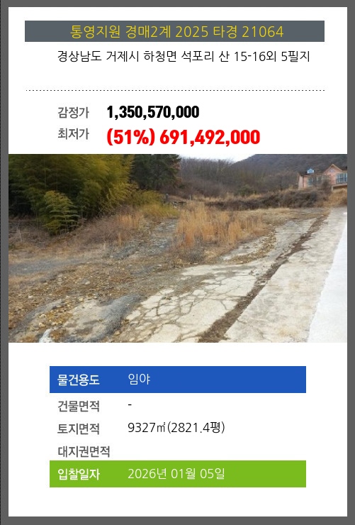 사건번호 2025 타경 21064 본건은 경상남도 거제시 하청면 석포리 산 15-16외 5필지소재하는 임야경매 물건의 포스팅입니다. 토지면적 [ 9327㎡ (2821.4평) ] 시세를 반영한 감정가 1,350,570,000에서3회 유찰되어