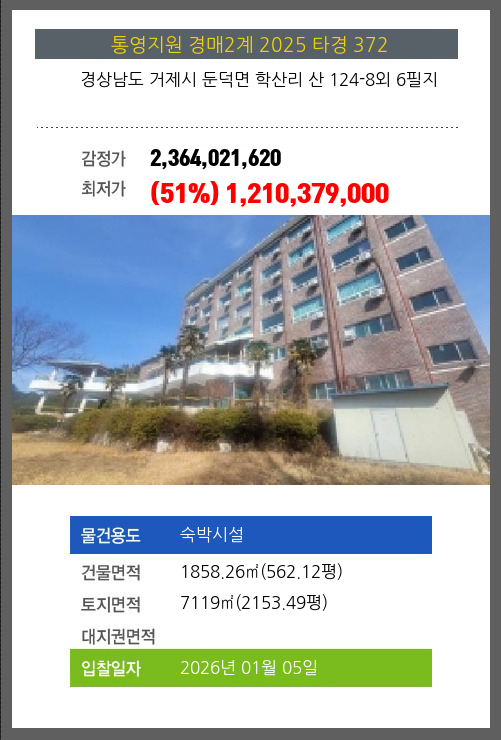 사건번호 2025 타경 372 본건은 경상남도 거제시 둔덕면 학산리 산 124-8외 6필지소재하는 숙박시설경매 물건의 포스팅입니다. 건물면적 [ 1858.26㎡ (562.12평) ]토지면적 [ 7119㎡ (2153.49평) ] 시세를