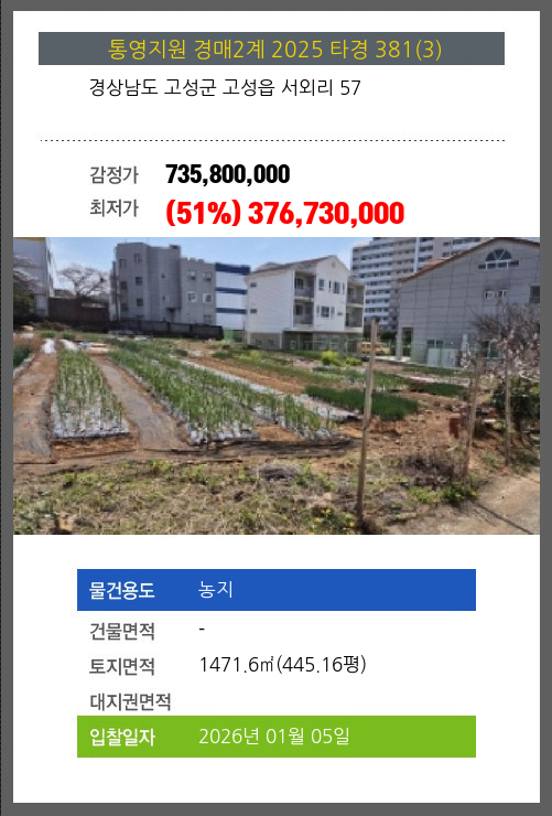 사건번호 2025 타경 381(3) 본건은 경상남도 고성군 고성읍 서외리 57소재하는 농지경매 물건의 포스팅입니다. 토지면적 [ 1471.6㎡ (445.16평) ] 시세를 반영한 감정가 735,800,000에서3회 유찰되어 감정가 대비