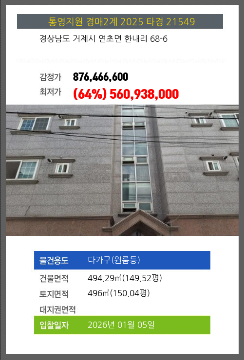 사건번호 2025 타경 21549 본건은 경상남도 거제시 연초면 한내리 68-6소재하는 다가구(원룸등)경매 물건의 포스팅입니다. 건물면적 [ 494.29㎡ (149.52평) ]토지면적 [ 496㎡ (150.04평) ] 시세를 반영한 감정가