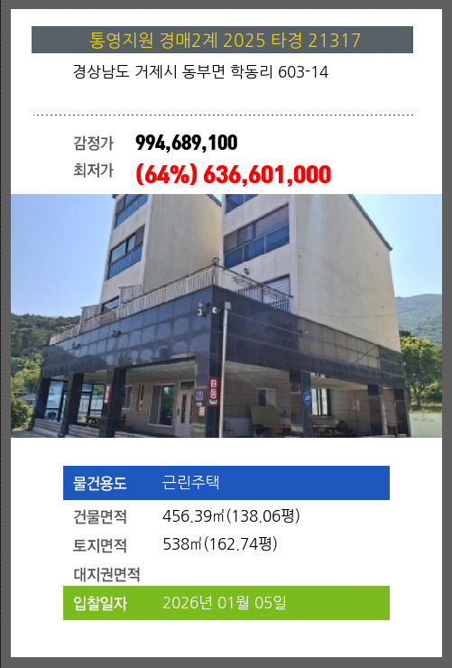 사건번호 2025 타경 21317 본건은 경상남도 거제시 동부면 학동리 603-14소재하는 근린주택경매 물건의 포스팅입니다. 건물면적 [ 456.39㎡ (138.06평) ]토지면적 [ 538㎡ (162.74평) ] 시세를 반영한 감정가