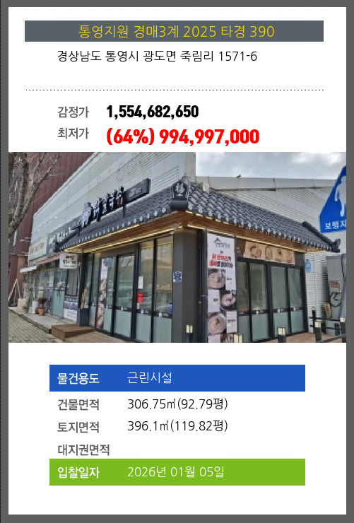 사건번호 2025 타경 390 본건은 경상남도 통영시 광도면 죽림리 1571-6소재하는 근린시설경매 물건의 포스팅입니다. 건물면적 [ 306.75㎡ (92.79평) ]토지면적 [ 396.1㎡ (119.82평) ] 시세를 반영한 감정가