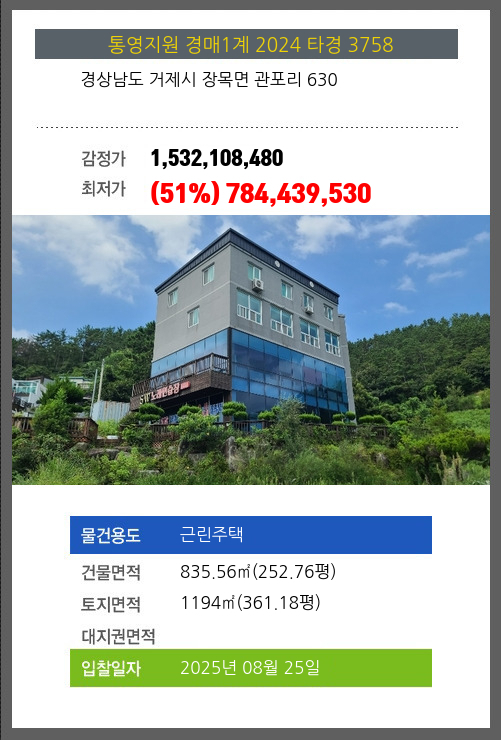 사건번호 2024 타경 3758 본건은 경상남도 거제시 장목면 관포리 630소재하는 근린주택경매 물건의 포스팅입니다. 건물면적 [ 835.56㎡ (252.76평) ]토지면적 [ 1194㎡ (361.18평) ] 시세를 반영한 감정가