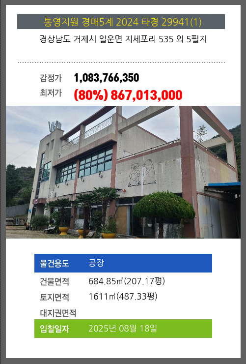 사건번호 2024 타경 29941(1) 본건은 경상남도 거제시 일운면 지세포리 535 외 5필지소재하는 공장경매 물건의 포스팅입니다. 건물면적 [ 684.85㎡ (207.17평) ]토지면적 [ 1611㎡ (487.33평) ] 시세를