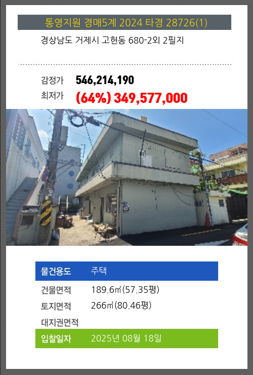 사건번호 2024 타경 28726(1) 본건은 경상남도 거제시 고현동 680-2외 2필지소재하는 주택경매 물건의 포스팅입니다. 건물면적 [ 189.6㎡ (57.35평) ]토지면적 [ 266㎡ (80.46평) ] 시세를 반영한 감정가
