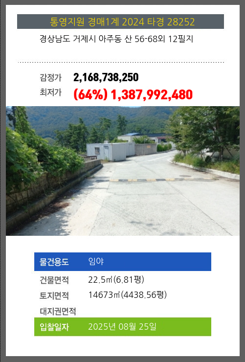 사건번호 2024 타경 28252 본건은 경상남도 거제시 아주동 산 56-68외 12필지소재하는 임야경매 물건의 포스팅입니다. 건물면적 [ 22.5㎡ (6.81평) ]토지면적 [ 14673㎡ (4438.56평) ] 시세를 반영한