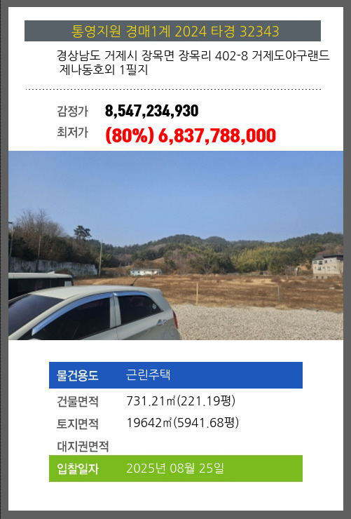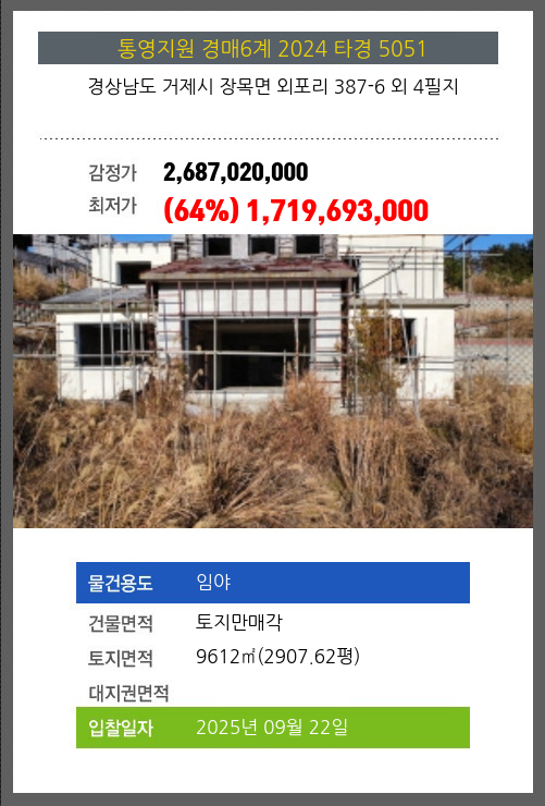 사건번호 2024 타경 5051 본건은 경상남도 거제시 장목면 외포리 387-6 외 4필지소재하는 임야경매 물건의 포스팅입니다. 건물면적 [ 토지만매각 ]토지면적 [ 9612㎡ (2907.62평) ] 시세를 반영한
