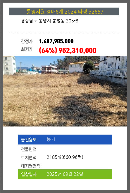 사건번호 2024 타경 32657 본건은 경상남도 통영시 봉평동 205-8소재하는 농지경매 물건의 포스팅입니다. 토지면적 [ 2185㎡ (660.96평) ] 시세를 반영한 감정가 1,487,985,000에서2회 유찰되어 감정가 대비 64%최저가