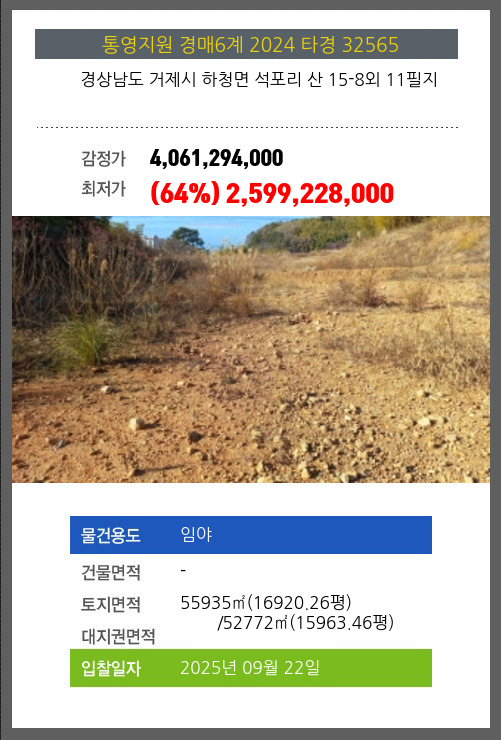 사건번호 2024 타경 32565 본건은 경상남도 거제시 하청면 석포리 산 15-8외 11필지소재하는 임야경매 물건의 포스팅입니다. 토지면적 [ 전체:55935㎡ (16920.26평) 매각지분:52772㎡ (15963.46평) ] 시세를 반영한 감정가