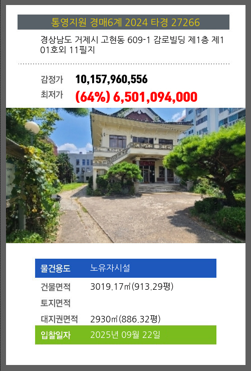 사건번호 2024 타경 27266 본건은 경상남도 거제시 고현동 609-1 감로빌딩 제1층 제101호외 11필지소재하는 노유자시설경매 물건의 포스팅입니다. 건물면적 [ 3019.17㎡ (913.29평) ]대지권 [ 2930㎡ (886.32평) ]