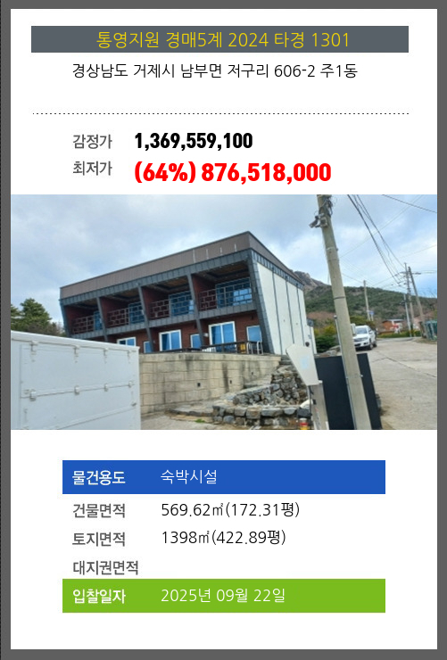 사건번호 2024 타경 1301 본건은 경상남도 거제시 남부면 저구리 606-2 주1동소재하는 숙박시설경매 물건의 포스팅입니다. 건물면적 [ 569.62㎡ (172.31평) ]토지면적 [ 1398㎡ (422.89평) ] 시세를 반영한