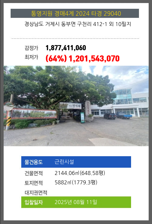 사건번호 2024 타경 29040 본건은 경상남도 거제시 동부면 구천리 412-1 외 10필지소재하는 근린시설경매 물건의 포스팅입니다. 건물면적 [ 2144.06㎡ (648.58평) ]토지면적 [ 5882㎡ (1779.3평) ] 시세를