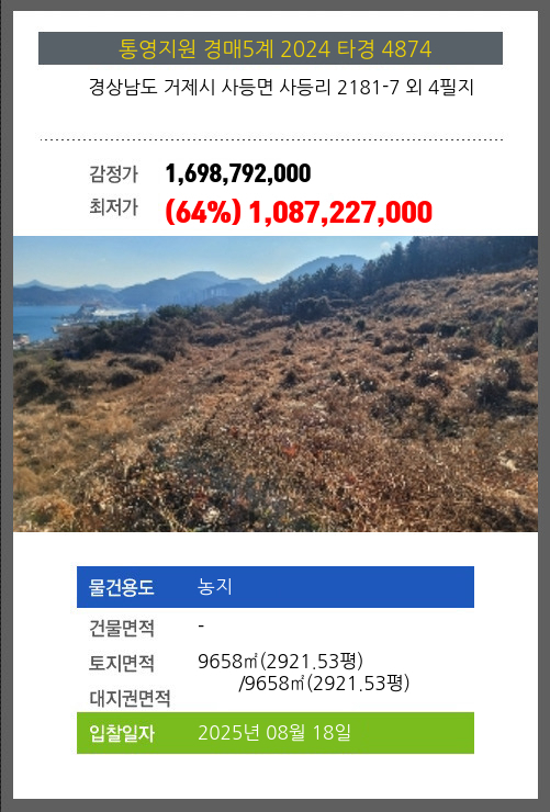 사건번호 2024 타경 4874 본건은 경상남도 거제시 사등면 사등리 2181-7 외 4필지소재하는 농지경매 물건의 포스팅입니다. 토지면적 [ 전체:9658㎡ (2921.53평) 매각지분:9658㎡ (2921.53평) ] 시세를 반영한 감정가