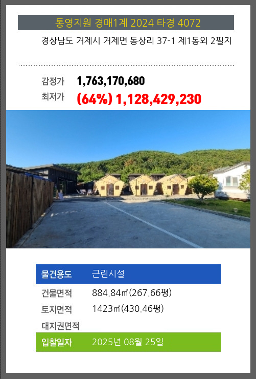사건번호 2024 타경 4072 본건은 경상남도 거제시 거제면 동상리 37-1 제1동외 2필지소재하는 근린시설경매 물건의 포스팅입니다. 건물면적 [ 884.84㎡ (267.66평) ]토지면적 [ 1423㎡ (430.46평) ] 시세를