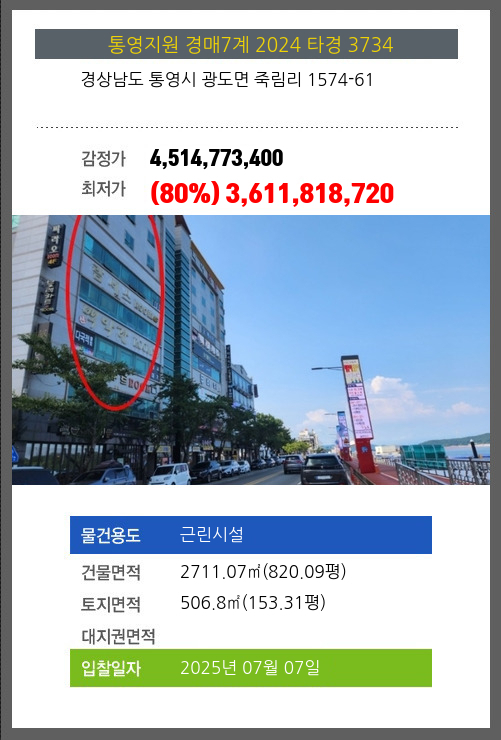 사건번호 2024 타경 3734 본건은 경상남도 통영시 광도면 죽림리 1574-61소재하는 근린시설경매 물건의 포스팅입니다. 건물면적 [ 2711.07㎡ (820.09평) ]토지면적 [ 506.8㎡ (153.31평) ] 시세를 반영한 감정가