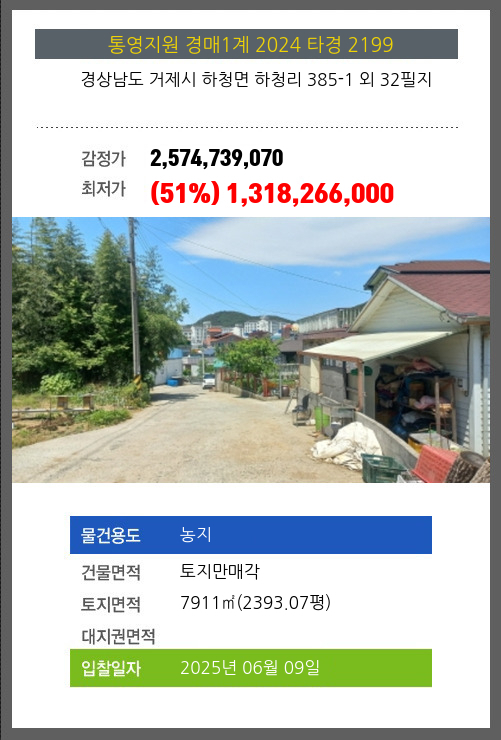 사건번호 2024 타경 2199 본건은 경상남도 거제시 하청면 하청리 385-1 외 32필지소재하는 농지경매 물건의 포스팅입니다. 건물면적 [ 토지만매각 ]토지면적 [ 7911㎡ (2393.07평) ] 시세를 반영한