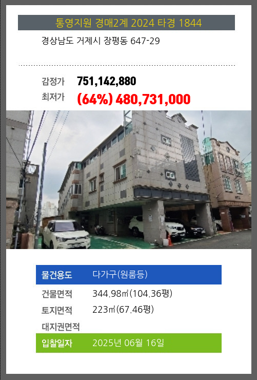 사건번호 2024 타경 1844 본건은 경상남도 거제시 장평동 647-29소재하는 다가구(원룸등)경매 물건의 포스팅입니다. 건물면적 [ 344.98㎡ (104.36평) ]토지면적 [ 223㎡ (67.46평) ] 시세를 반영한 감정가 751,142,880에서2회