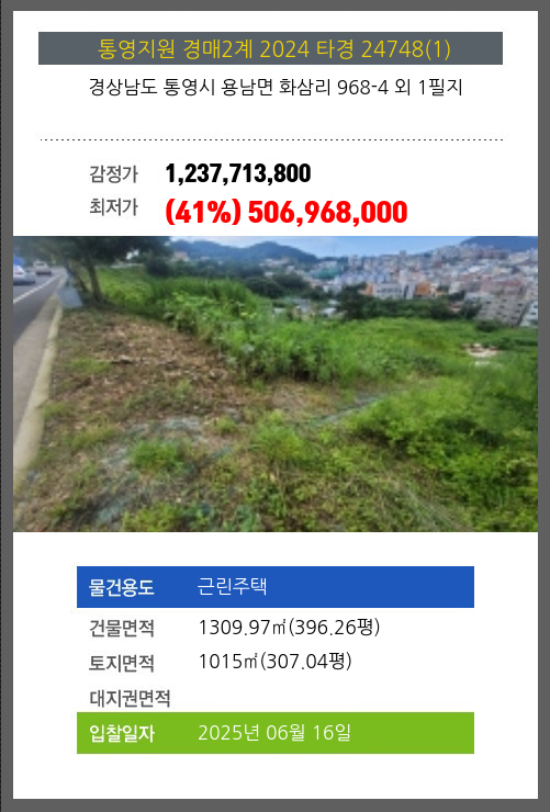 사건번호 2024 타경 24748(1) 본건은 경상남도 통영시 용남면 화삼리 968-4 외 1필지소재하는 근린주택경매 물건의 포스팅입니다. 건물면적 [ 1309.97㎡ (396.26평) ]토지면적 [ 1015㎡ (307.04평) ] 시세를